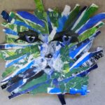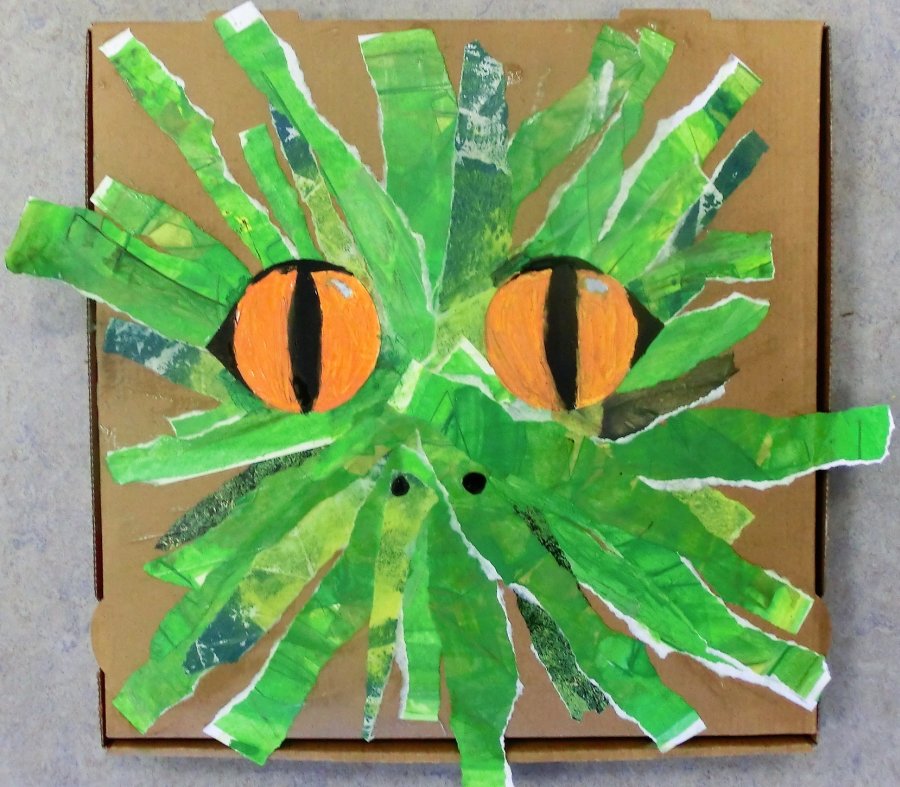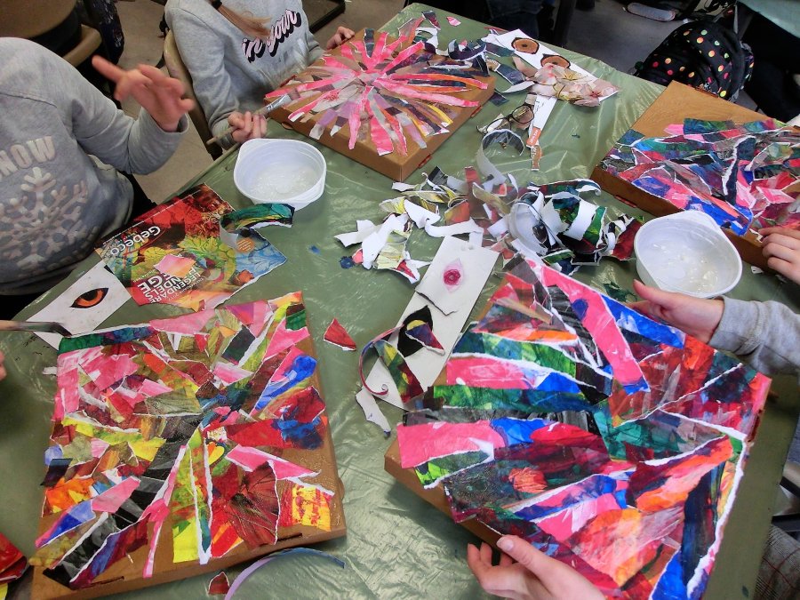 Januar • Aus vorgefertigten farbigen Papieren – gemalt und gespachtelt – reißen wir Streifen, die wir dann auf Pizzakartons aufkleben, teilweise auch mit farbigen Streifen aus Zeitschriften.